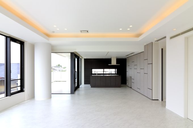 【SHINCHIKU】 目黒区にある閑静な住宅街に建つ共同住宅最上階のオーナー邸の提案。「光庭」を間取りの中心に計画し玄関ドアを開...