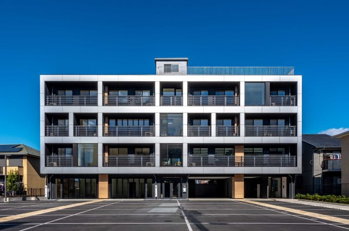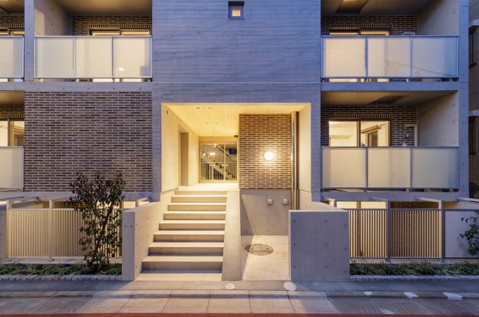 【SHINCHIKU】 閑静な住宅街に建つ共同住宅。暖かみのある石器質ボーダータイルとコンクリート打放しを対比した重厚感のある外観...