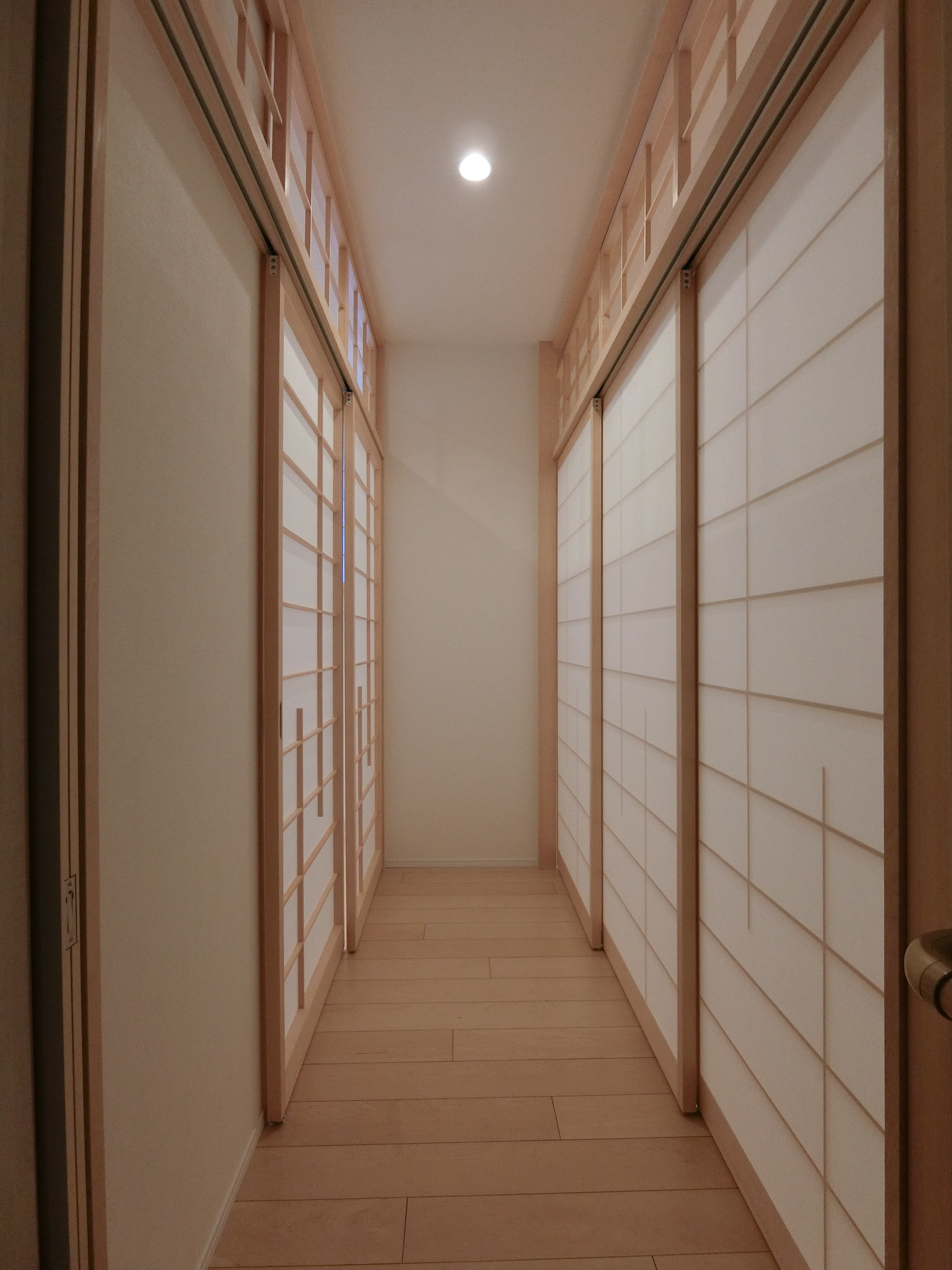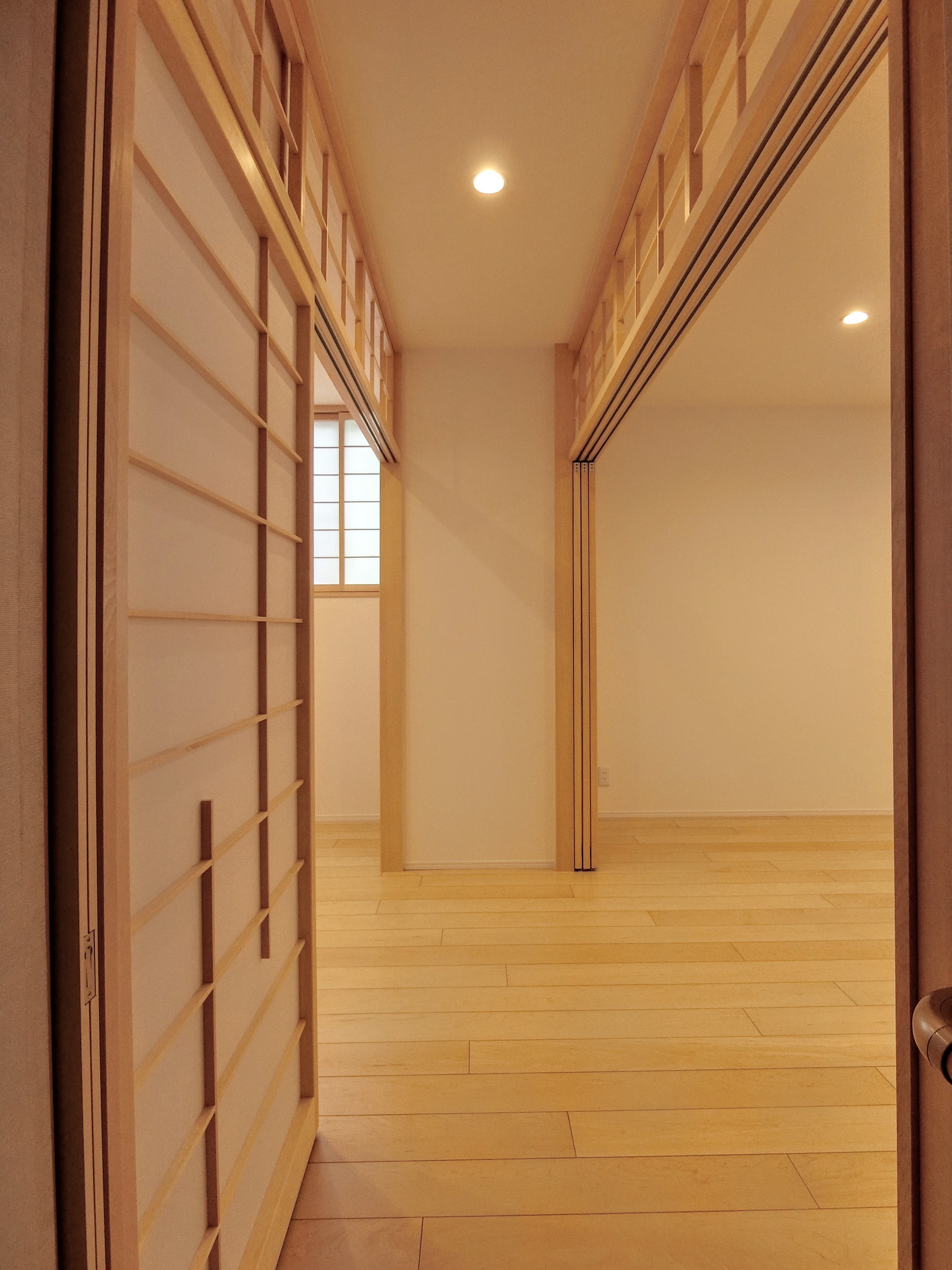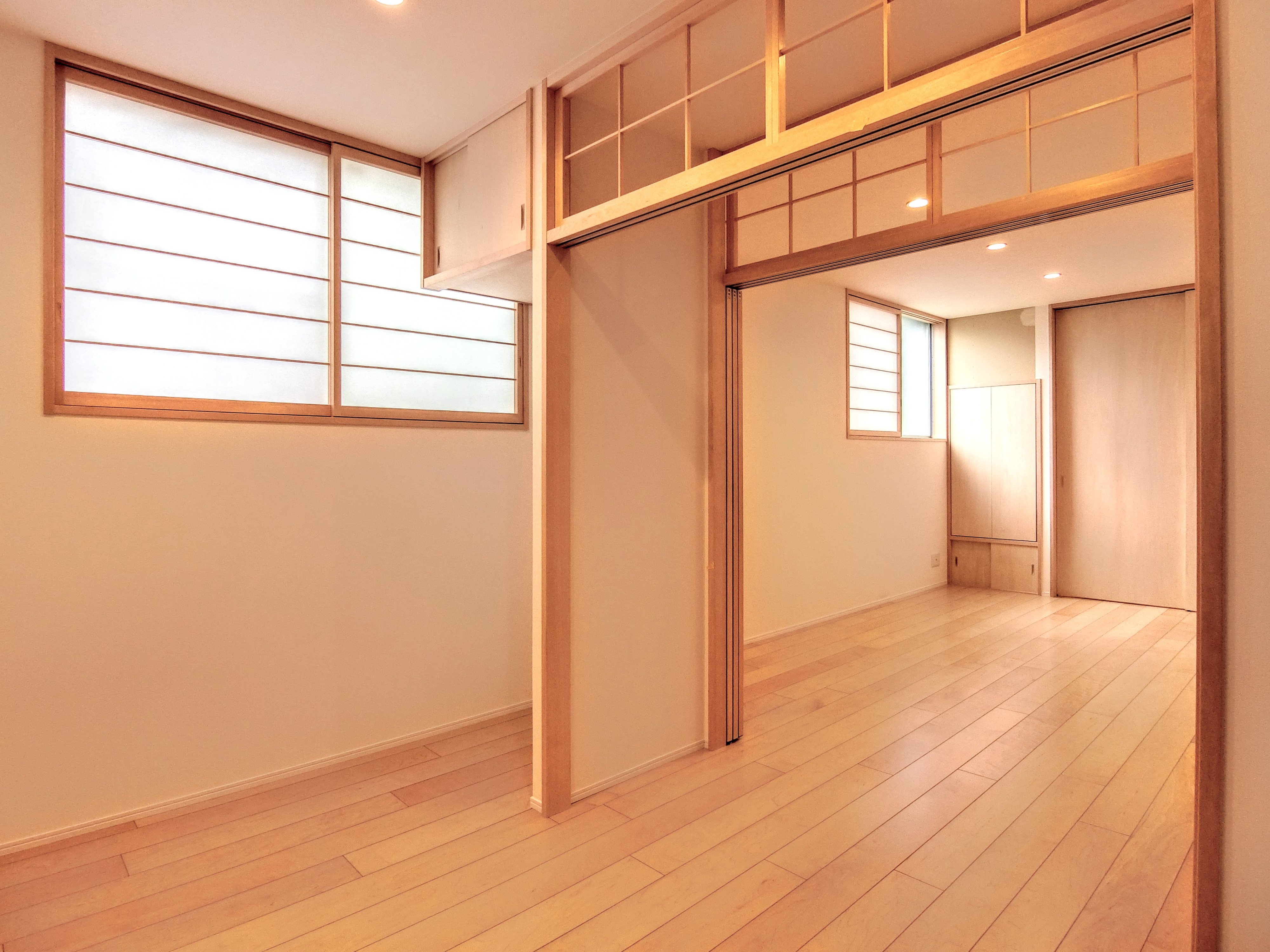 東中野駅最寄りの個人住宅の再生。母屋から渡り廊下で繋がれた離れを客間・寝室にリノベーション。和紙から外光を柔らかく採り入れる和モダンデザイン。普段は1室として広々とした寝室、お客様を招くときは寝室と客間として間仕切る事ができるフレキシブルな計画の提案。
